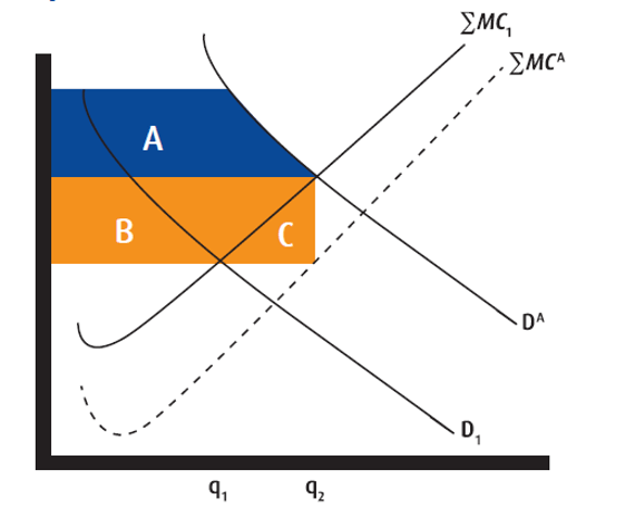 The concept of surplus or efficiency (both in consumption and production) can be used to calibrate the economic impact of accreditation versus the impact of non-accreditation. This is illustrated in Figure 2, which presents the two scenarios where the consumption bundle, demand and marginal cost of production of products and services are given by q1, D1 and Sum MC1 respectively in the scenario without accreditation and q2, DA and Sum MCA respectively in the scenario with accreditation. Area B shows the increase in the consumer’s willingness to pay the price premium for accredited products. Area A shows the additional benefits from accredited products and services accruing to the consumer. This includes productive efficiency, which decreases an organization’s average and marginal cost of production. The increase in efficiency can lower the competitive market equilibrium price. Assuming the accredited market price premium does not change such that the gain from productive efficiency results in higher profit markets, the additional gain (bounded by consumption bundle q2) is seen in Area C.
