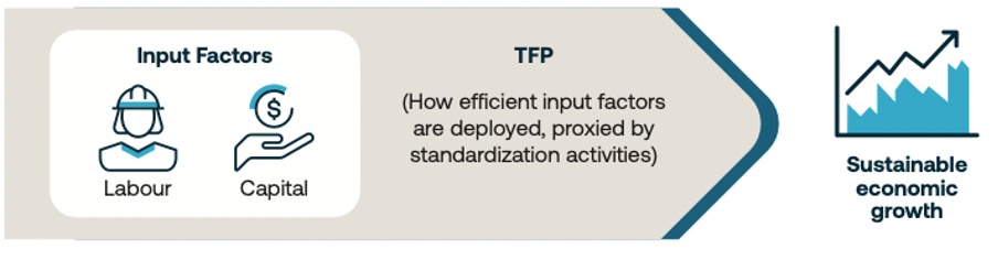 Each study used a similar methodology, which quantifies the impact of standardization on a national economy based on the Cobb–Douglas production function and allows researchers to establish the contribution to the broader economy. Economic growth is driven by the quantity of labour and capital available and their efficiency. As an economy matures, the output produced by each additional input unit diminishes. Economic growth over the long run can be sustained by improving the efficiency with which these inputs are used, known as Total Factor Productivity (TFP). TFP combines technological knowledge and efficiency to measure how effectively capital and labour can be combined to produce sustained economic growth. Economic growth results from the interaction of these three components (labour, capital and TFP), as seen in Figure 1.